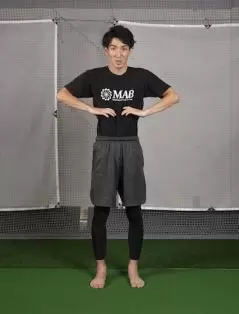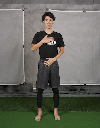 胸で呼吸できているかの確認は「息を吐き切って息を吸う」のを繰り返す際に腹に左手、胸に右手を置いておく。胸で呼吸ができると、胸に置いた右手が横隔膜の動きによって上下する。左手が動くという人は、横隔膜を使って呼吸できていません。