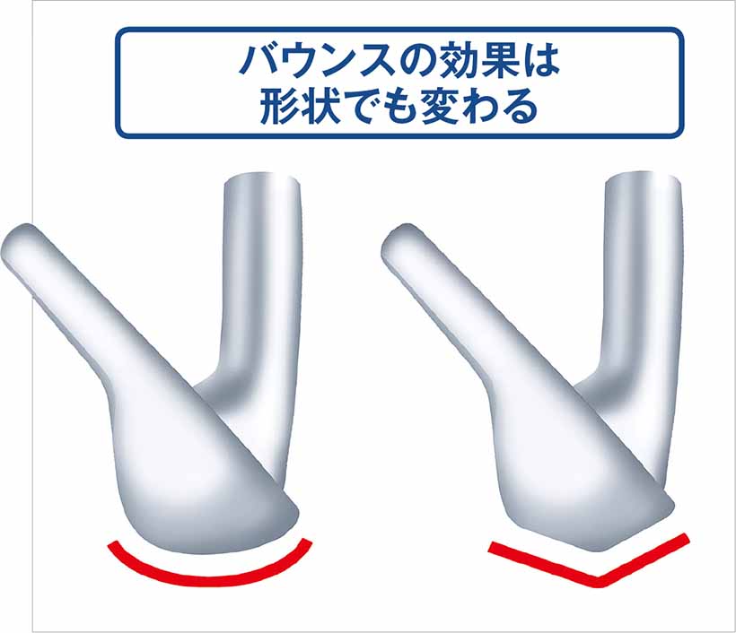 ウェッジに限らず、アイアンでもバウンス角はソールの抜け具合に影響する。接地するソール面エリアと相まって、バウンス効果を決定する。