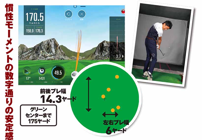 3人のテスターが5球ずつショットしたので、合計15球のデータを計測した。その結果、グリーンの直径が30ヤードと想定した場合、グリーンを外したショットは1球だけ。14/15だから、グリーンオン率は93・3%。関プロを除いた、編集部員2人でも9/10で90%になる。