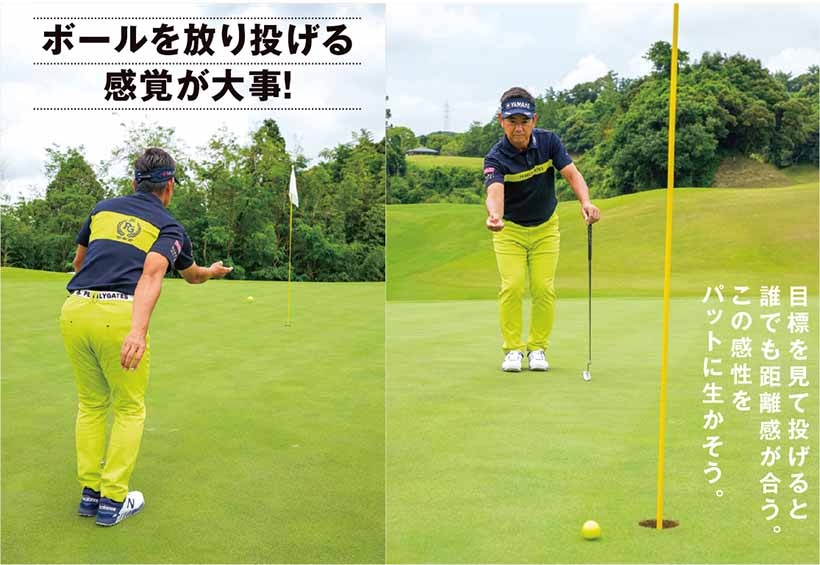 目標を見て投げると誰でも距離感が合う。 この感性をパットに生かそう。