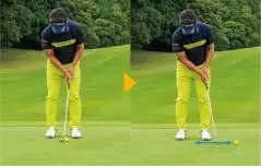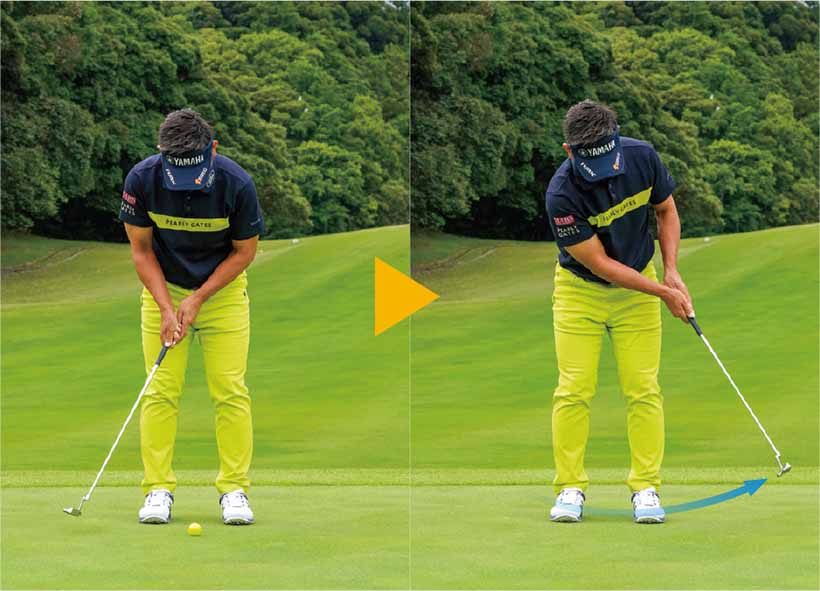 テークバックの位置や大きさなどは気にせず、インパクトからフォローにかけての動きを重視。これによりヘッドが前に出て、ボールのコロがりがよくなる。
