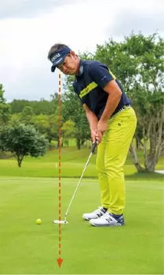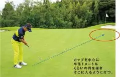 本番ではカップを見ながら素振りを行い、ボールのコロがりをイメージすることが大切。こうすると、結果的に適正な振り幅になり、距離感が合う。