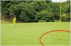 どんな距離でもカップに入れるつもりで打つというプロもいますが、私の場合は、長い距離ほどターゲットを大きく設定。カップを中心に半径1メートル(直径2メートル)くらいの円を描き、その円の中にボールが入るように打ちます。カップインは狙いません。