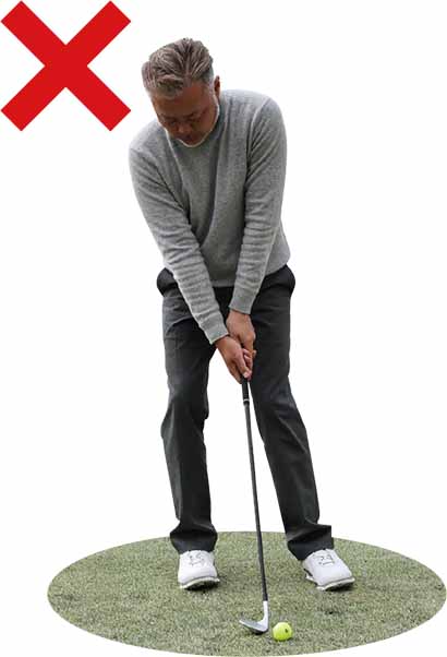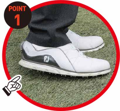 ダウンブローで打てているかどうかをチェックするために、練習の始めと終わりには必ずSWでアプローチショットを打ちます。ポイントはアドレス時の体重配分です。左足6割、右足4割とよくいいますが、ぼくは左足10割で立ちます。右足は靴の中でツマ先立ちして親指で地面を押さえる感じです。実際、完全に0にはできませんが自分の中では限りなく0に近いイメージです。テークバックで右足に乗ると軸が右に傾いてアッパーブローになりやすいので、左体重をキープしたままクラブを上げて下ろします。