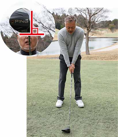 「顔の前で地面に対して90度にフェースを合わせます。そのまま地面に置くと左にかぶって見えますが、実はこれが本当のスクエアです」