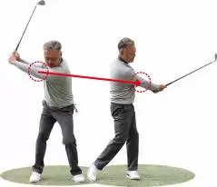 写真右)フィニッシュのヒジの位置は低めに抑える。