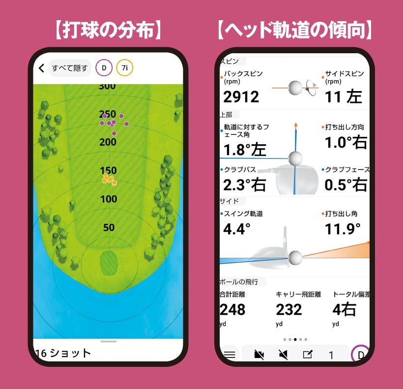 インパクトのヘッド軌道やフェース向き、打球の打ち出し角スピン量、飛距離など。