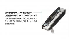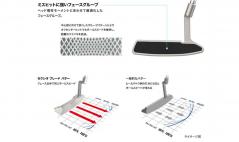 「ゼクシオ ブレード パター」は、左右方向の慣性モーメントを大きくすることでフェースのブレを抑制し、オフセンターヒットでの直進性を向上。またフェース面は、中心部に向けて狭くしたグルーブパターンを装着することでオフセンターヒットでもボールスピードを維持し、距離のばらつきを低減。3種類の長さ(34、32、31インチ)と左用をラインナップし、幅広いゴルファーに対応している。
