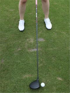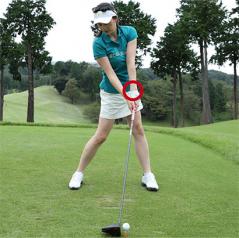 基本のスタンスについて説明しましょう。ドライバーショットのスタンスでしたら、両足を自分の肩幅か、それよりも少し広げて、両足のツマ先を10〜20度くらい開いて「逆ハ」の字に立つのが理想的な立ち方です。両ヒザは軽く曲げて、ラクにしておきます。男性にありがちな両ヒザを左右に広げすぎた極端なガニ股姿勢や、女性に多く見られる両ヒザを絞りすぎた内股姿勢はNGです。その理由としては、下半身が硬くなって股関節が稼動しにくくなるためです。