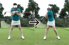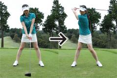 アドレスで骨盤前傾ができていれば左右の股関節の重心移動がスムーズにでき、カラダが正しく回転してクラブを正しい軌道で振れるようになります。アドレスで骨盤が立っていると腰がヨコに回転してしまい、バックスイングで上体が起きてしまいます。下半身をガチガチに固めても、骨盤のややタテ方向の回転ができず、股関節が稼動しません。「腰を切る」とか「股関節と入れる」とよくいいますが、これは骨盤を正しく稼動させる動きのこと。そこでワイドスタンスに構えて素振りを繰り返してみてください。股関節が止まったままでは振れませんから、骨盤をしっかり使ってスイングする感覚が簡単につかめます。この感覚を大事にして、いい意味でどっしり感のあるスタンスで構えてくださいね。
