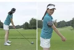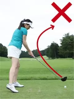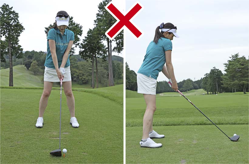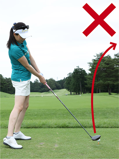 軽くオープンスタンスに構えるといっても、肩も目標よりも左に向けてしまうのはNG。とくに飛ばしたい気持ちが働くと気づかないうちに右肩や右腕に余分な力が入り、右ヒジが伸びて右肩が前に出たアドレスになりがちです。こうするとダウンスイングでも右肩が突っ込んでアウトサイドインの軌道となり、この場合はフェースがかぶって当たりやすいので左へのヒッカケが生じるパターンがほとんどです。