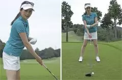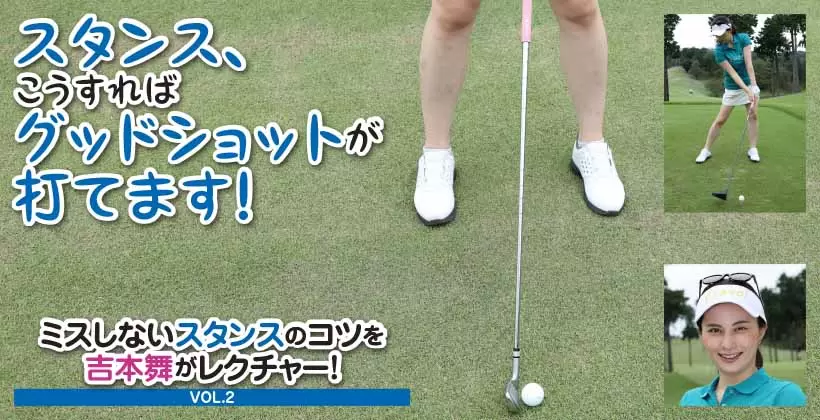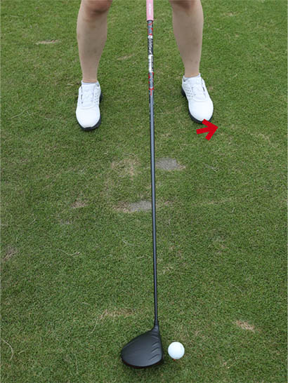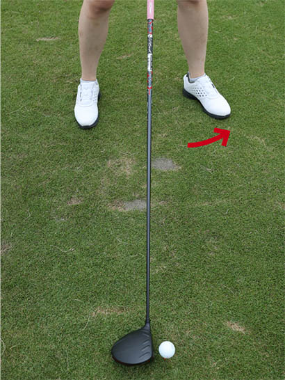 スクエアスタンスから左足ツマ先を軽く開くだけでもいいですし、左足を少し後ろに引いて左ツマ先を45度くらい開いてもOK。オープンスタンスで立って、遠くの目標を見たときに左肩が目標よりもやや左を向いて見えるのがスクエアなラインです。このようにスクエアに立ったときの視界に慣れておくことも大事です。また左ツマ先を開いて軽くオープンスタンスに構えるとインパクトで腰が詰まりにくく、フォロースルーへと振り抜きやすいというメリットもあります。