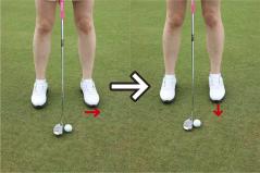 パットの場合は下半身が邪魔をしなければ基本的にはどんな立ち方でも構いませんが、左に引っかけやすい人は若干オープンスタンスに立つのがいいと思います。左足のツマ先を開いてオープンに構えると手元を動かしやすく、パターヘッドを少し右に出しやすい。とくにショートパットを打つときにインパクトで手が止まってフェースがかぶって当たり、カップの左に外してしまうことが多い人に効果的です。ただし、手元は動くのに上体が突っ込んで左に引っかけるタイプでしたら、逆にカラダの左サイドの壁が作りやすいように左ツマ先を真っすぐ向けて構えるのがいいでしょう。