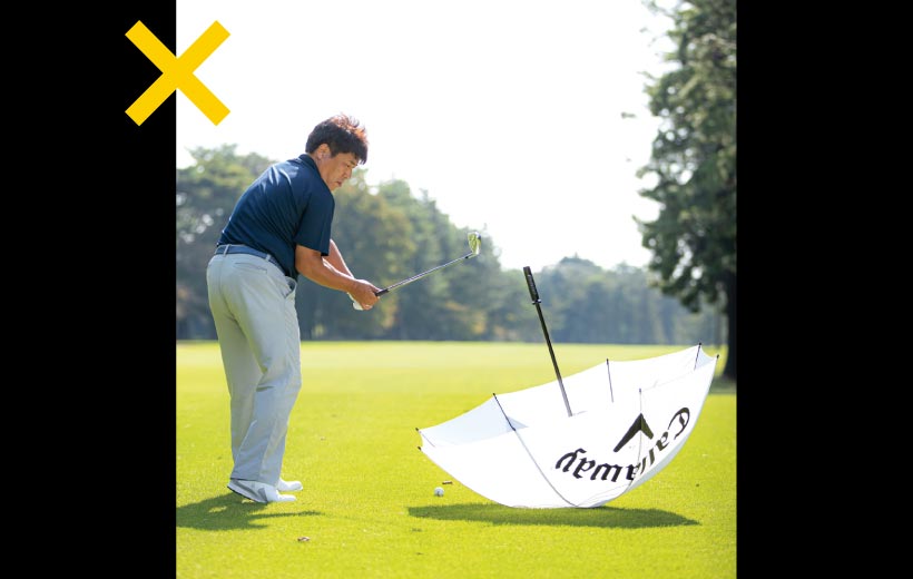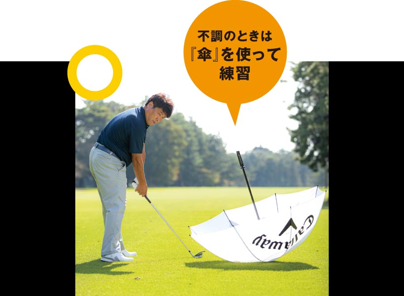 ヘッドを内側から入れるポイントはお腹の動きです。ダウンスイングでお腹が地面を向いていれば、手元が体から離れないからインサイドから下りてくる。逆にお腹が横や上を向くと、アウトサイドからヘッドが下りてきてしまう。そんなときはボールの前に傘をおいて、傘に当たらないようにボールを打つ練習をよくしています。