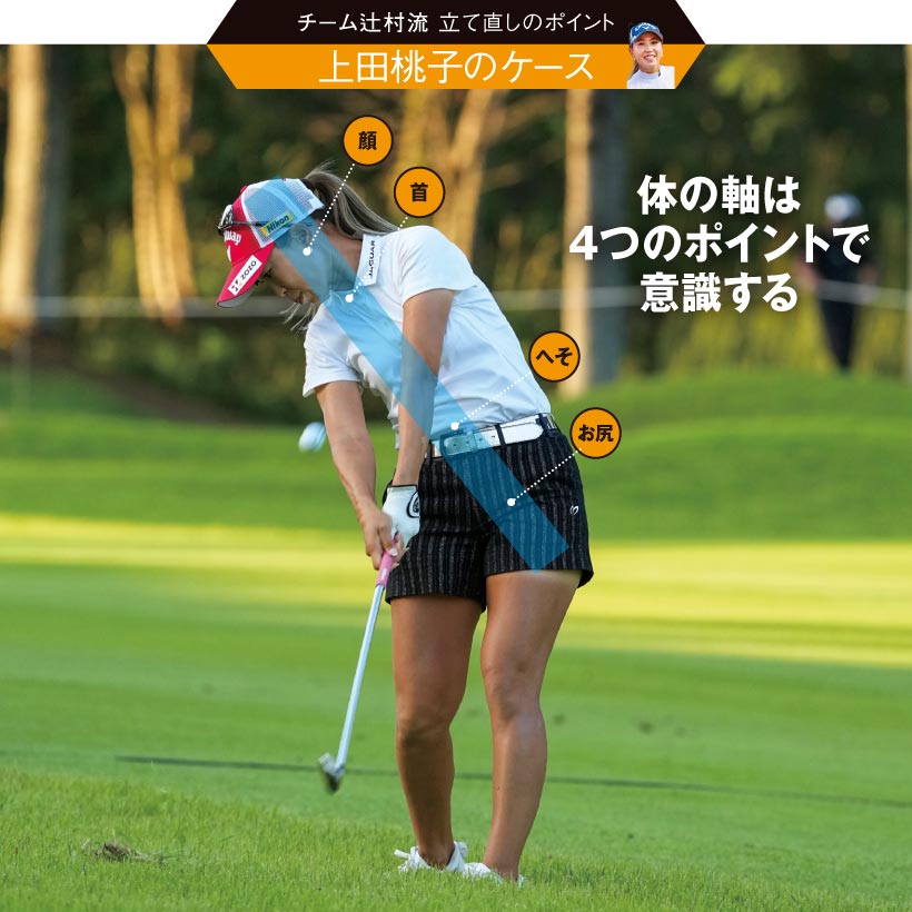 辻村は「今年の日本女子オープンで桃子のスイングは完璧だった」と振り返る。そのポイントの1つがインパクトの瞬間の軸。体の軸を意識することは、スイングの調子を上げていくことにつながるそうだ。