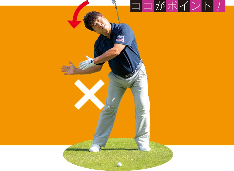 『ココがポイント!』右ヒジが体から離れると右肩が前に出やすくなる