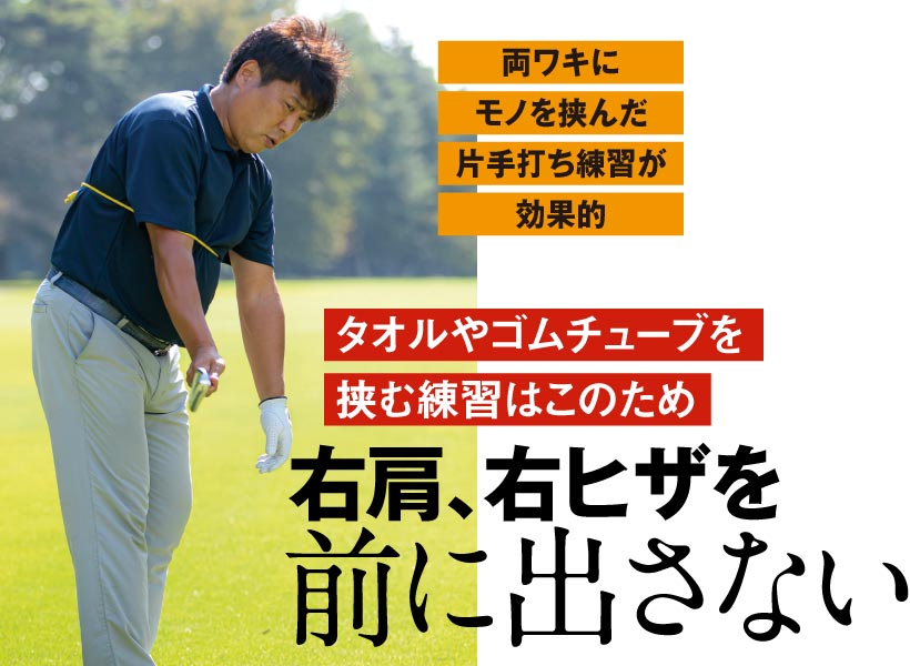 調子が悪くなってくると、まず右肩が体の前に出てきてしまう。右肩が前に出ると手元が体から離れてしまうし、インサイドからヘッドが下りてこない。この動きを修正するためには、トップで右ワキを体から離しすぎないこと。右ワキが完全に開くと、右ヒジが自由に動くので切り返しで右手がループしたりして右肩が前に出やすくなってしまう。調子が悪くなると、よく両ワキにタオルやゴムチューブを挟んで練習させますが、それは右ワキを締めて打つ感覚をつかむためです。