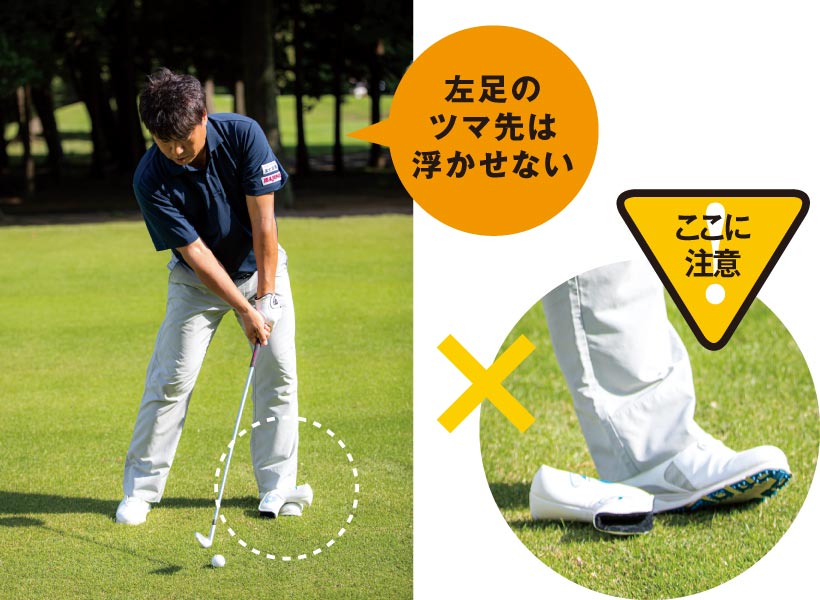 もう1つ、調子が悪くなってくると右ヒザが前に出て、下半身がバタバタしたスイングになってしまう。もちろん、右足を蹴る動きは必要ですが、右ヒザが前に出るとカット軌道になってしまいます。右ヒザが前に出る要因は、右足を回しながら蹴るからです。足元が回ると右足だけでなく、左足も動いてしまう。その動きを直すために左足のツマ先にヘッドカバーを置いて、それを落とさない練習をよくやっています。
