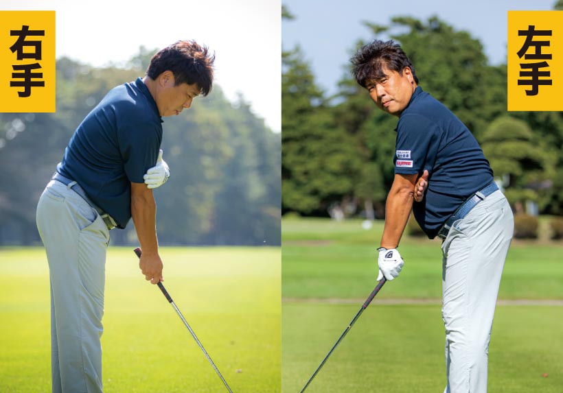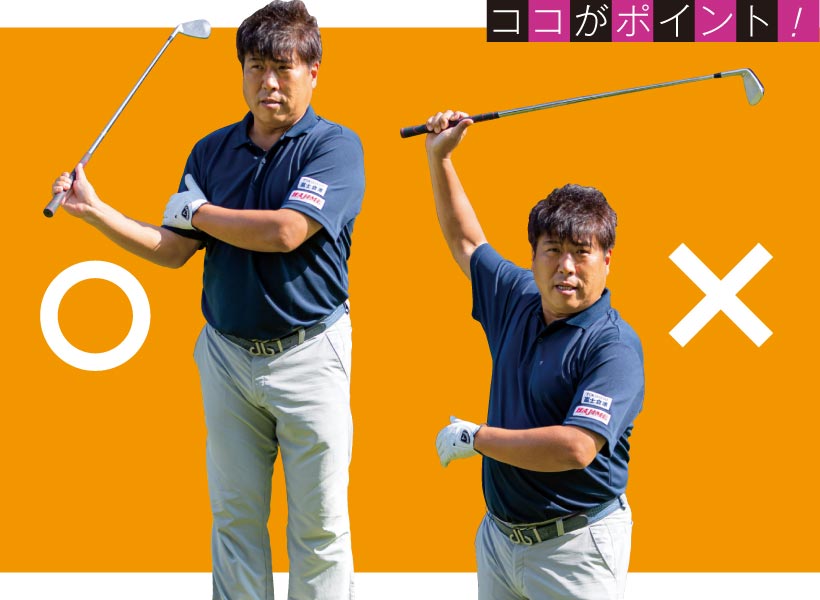 理想的なテークバックは、ヘッドを「ゆっくり、低く」動かすこと。ゆっくりした始動なら体が起き上がったり、軸が左右にブレることはありません。「ゆっくり、低く」上げるポイントは左腕は少し体から離して、右腕を体にくっつけて構えることです。左腕だけを体から離して構えておけば、左腕でクラブを動かすのでヘッドが低く動きます。逆に右手リードでヘッドを動かそうとするとヘッドが高く上がりやすい。