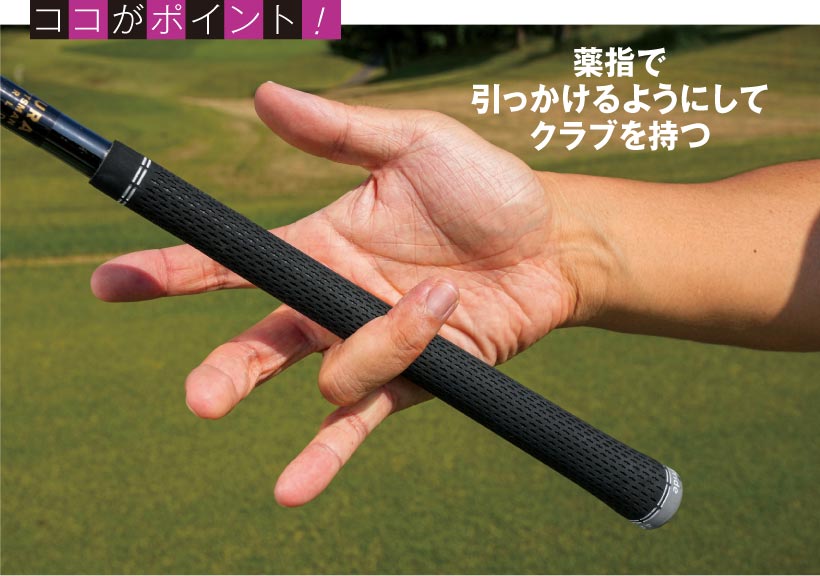 [ココがポイント!]薬指で引っかけるようにしてクラブを持つ