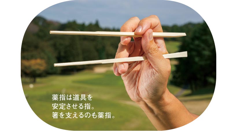 軽いドローが出ればちゃんと使えていますが、それには振り子で打つ練習をします。ポイントは薬指。箸を使う時もそうですが、支えて動かない薬指はインナーマッスルと連動します。薬指にクラブを引っかけ、親指と人さし指は触れるだけくらいの感じでクラブを持つと、手先を使わず正しい振り子運動ができ、クラブがイン・サイド・インに動きます。
