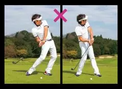 その意味で有効なのが歩くように打つこと。歩く時に足を踏み替えるようにスイングでは足の圧を変えます。スイングでは体重移動をすると言われますが、ターゲットを意識すると切り返し以降で左に体重移動したり踏み込んだりします。これがボールやターゲットへの過剰な動きをもたらすので、バックスイングでは左足に、切り返し以降では右足に圧をかける。これでターゲットに向かいすぎる動きを緩和できます。