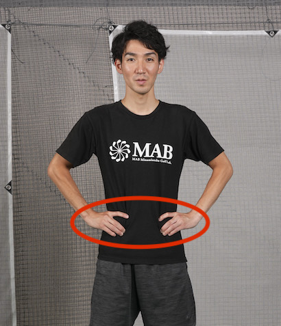 まず、正しい腹式呼吸は息を吸った際にお腹の前側だけでなく、横側、背側にも空気が入らなければいけません。それを確かめるには親指は背側、ほか4本の指はお腹側、親指と人差指をつなぐ手のヒラのへりは横腹につくように両手を腰にあてて息を吸います。お腹の前側、横腹、背中の3か所が膨らめばOKです。3か所すべてに空気を広げられると腹圧を高めることができるということになります。