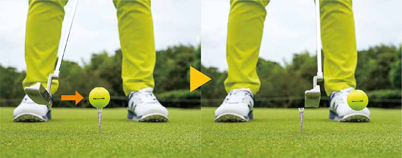 そして、インパクトでそのティに触れないように、ヘッドをできるだけ水平に動かします。最初は小さい振り幅から始めてください。こうすると真横からはたく動きを作りやすくなり、フェースの芯とボールの芯が揃うことでコロがりがよくなります。ヘッドが下から入る人はティに当たってしまうので、セルフチェックとしても有効です。