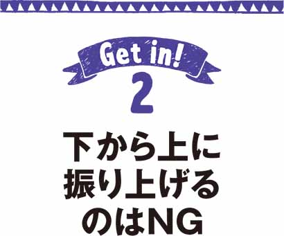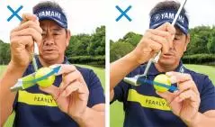 下から上に振り上げると、フェースが開いて芯に当たらない(左)。反対にヘッドを上から入れると、ボールが跳ねてしまい、コロがりが極端に悪くなる(右)。
