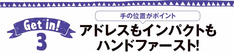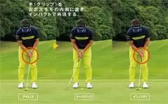 手(グリップ)を左足太モモの内側に置き、インパクトで再現する。
