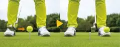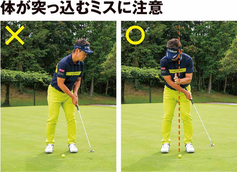 加えて、下から上に振り上げるミスも未然に防止できるのがメリット。ハンドファーストのインパクトはボールをつかまえるイメージが湧き、パットでも強い球を打ちたい私にとってはとても重要な要素です。ただし、手を出しすぎるとボールを上から潰してしまうので、左足太モモの内側が目安です。