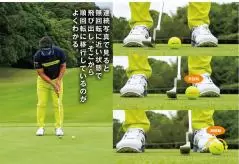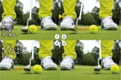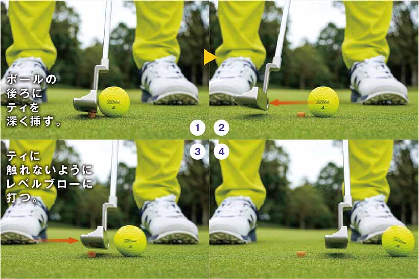 ボールのコロがりが悪いという人は、次のような練習をしてみましょう。まず、ボールの後ろ側(飛球線後方)にティを深く挿し、ティの頭の部分だけが表面に出るようにセットします。ティの代わりにコインを置いてもかまいません。