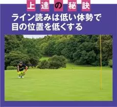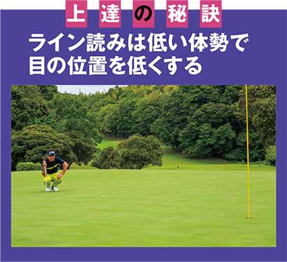 グリーンの傾斜は、立って見るよりも、低い体勢で目の位置を低くしたほうが読みやすく、細かいアンジュレーションがわかる。初~中級者はこの動作をおろそかにしがちなので気を付けよう。