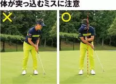 ハンドファーストのインパクトを作ろうとするあまり、体が突っ込んだり流れたりする人がいる(左)。インパクト後まで体をしっかり残すことが鉄則だ(右)。