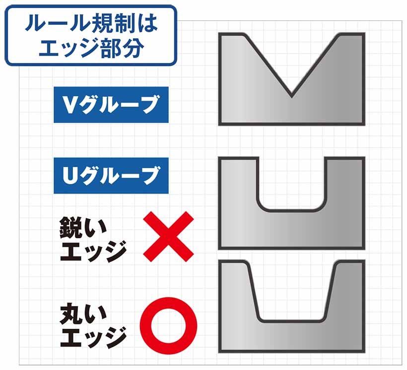 元々は鍛造のVグルーブが主流だったが、鋳造やミーリング加工で角溝(Uグルーブ)がウェッジの定番に。現在はエッジの丸み、幅、断面積のサイズ、間隔など細かい規制がある。