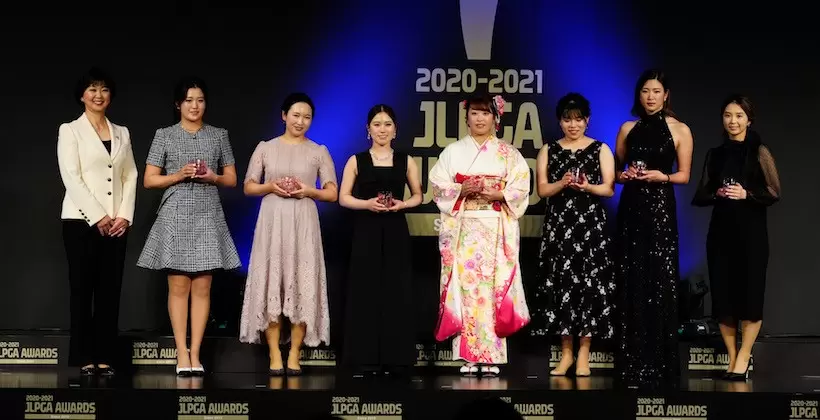 21日(水)、「2020-2021JLPGAアワード」の会場には、ドレスや着物などで着飾った2020-21シーズンの優勝者と各部門の受賞者が壇上に集合し、華やかに行われた