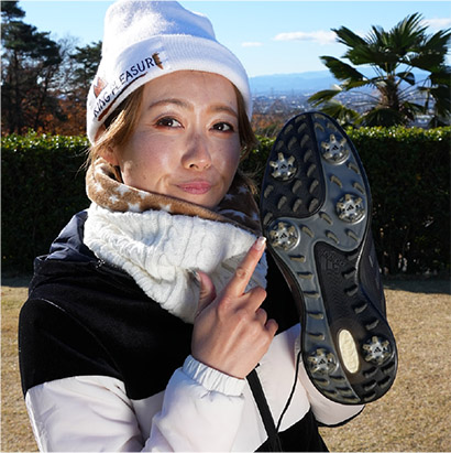 シューズは最近ではスパイクレスが多く出回っていて、私もスパイクレスをよく履いています。でも冬ゴルフでしたら滑りにくいシューズがオススメ。ソフトスパイクならグリップ力が高いですし、日陰の傾斜地で足元が滑らせてしまう心配もナシ。平らな場所が多い林間コースとか斜面が多そうな丘陵コースなど出かけるコースでシューズを使い分けてもいいですよ。
