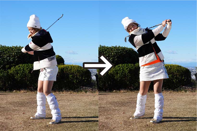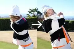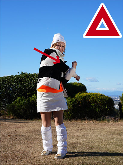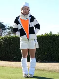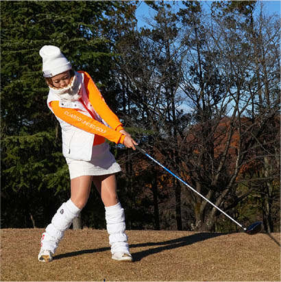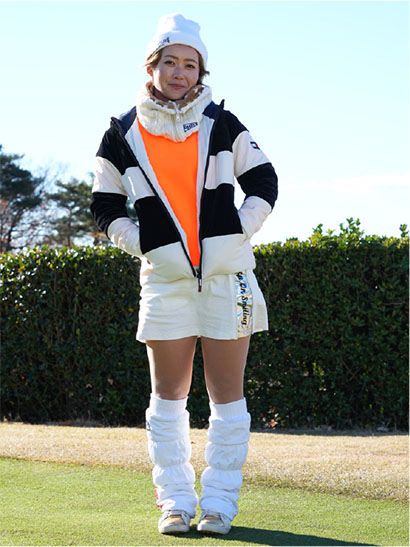 服装に関しては、冬ゴルフは厚着でカラダが回りにくいですよね。そういうときは機能性抜群のインナーに、風を通さないニットを着ればバッチリ! 今はゴルフに特化した防寒機能が高いウェアが結構出そろっていますから、専門のショップをのぞいてみるのも手です。ワキの下に羽毛があまり入っていないからカラダがスムーズに動いてスイングしやすいし、ダウンベストを着用するのもいい。写真では私は3枚しか着ていませんが、これでも寒さをあまり感じません。