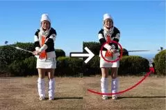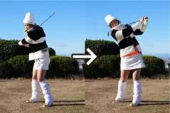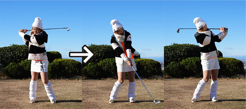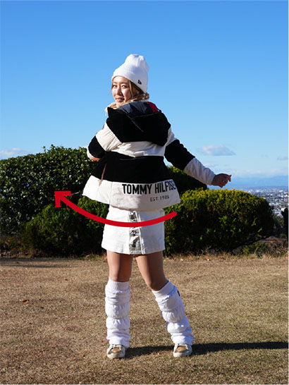 カラダが温まってきたら、今度は素振り。練習場のあるコースならボールを打つ前に素振りを多めにやってカラダをさらにほぐします。クラブは7番アイアンでもドライバーでもOK。練習場のないコースでしたら他のゴルファーがいない場所を選んで素振りしましょう。ポイントはクラブをビュンビュン振るよりも、手首をぐにゃぐにゃに! クラブヘッドの重さを利用してスイングする感じです。寒い日は腕や手が動きにくいので、手首やヒジの関節を十分にほぐしておくと本番でもスイングがスムーズにいきやすいんです。