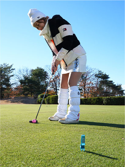練習グリーンでのパット練習は1メートルくらいのショートパットをいっぱいやっておきましょう。冬場のコースは練習グリーンとコースグリーンのスピードがまったく違うことが多いので、ロングパットの距離感をつかみにくいんです。だから長い距離は少し打っておくだけでOK。カップに直接入れてもいいし、グリーンフォークやティペッグを刺して、当てるのもよし。短い距離をカップインさせるイメージをつかんで、気分よくスタートホールに向かいましょうね!