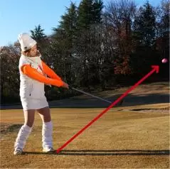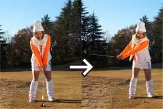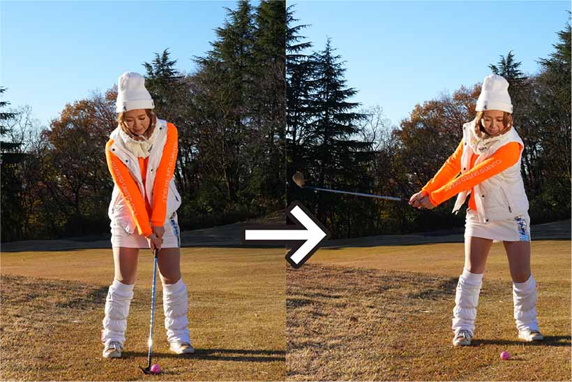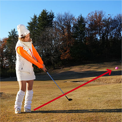 ボールを低く打ち出すときは両足の間隔を狭くし、ボールをカラダの中心線の前にセットします。両手の位置は左モモのツケ根の前。スタンスを広くして構える人が多いですけど、下半身が無駄に動きやすいので避けてくださいね。そして、スイングのリズムは速めに。ゆっくり振ると手首をコネてしまいやすいですから、「イチ」でテークバックして、「ニ」でインパクトするイメージ。両ワキを締めて胸を左右に回して打ちますが、フォロースルーの意識はいりません。惰力でクラブヘッドが低く出て、自然に止まるという感覚です。打つ前に素振りを2〜3回繰り返して感じをつかんでおくとグッド!
