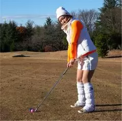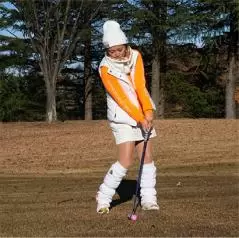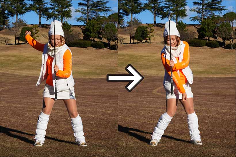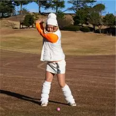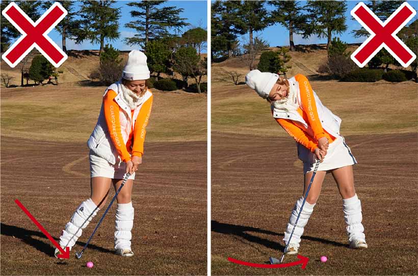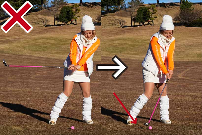 私は冬にアマチュアの方々のラウンドレッスンをする機会が多いんですけど、うまい人たちってアイアンショットで上から打ち込もうとするんです。夏はターフがきれいに取れてグッドショットが打てても、冬は当たりの薄いトップに。アレレ? ってミスの連発でお寒いゴルフじゃ、面白くないですよね。