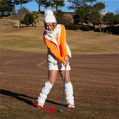 夏はクラブヘッドをボールの少し手前から入れるイメージでもいいけれど、冬はフェアウェイの芝が薄くて地面が硬いため、ソールが跳ねてトップになりやすいんですよ。じゃ、どうするかというとインパクトの打点を少し手前にすればOK。ボールを通常よりも1個分内側に入れて、あとは普段どおりにスイングしましょう。