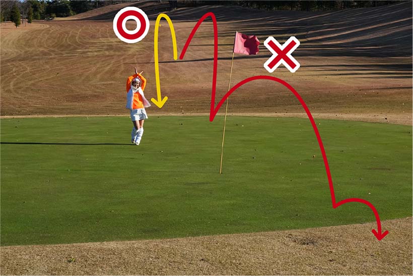 日当りのいいグリーンや午後の時間帯などグリーンが柔らかくなっていれば止まりやすいけれど、朝早い時間などはボールが止まらないと思って、グリーンに直接乗せないで、手前の花道で止めるつもりで打てばバッチリ! なので1クラブ小さめのクラブを持つのがオススメ。手前にバンカーなどのハザードがあれば、ボールのコロがりも予測してバンカーなどを避けて通りましょうね。