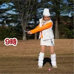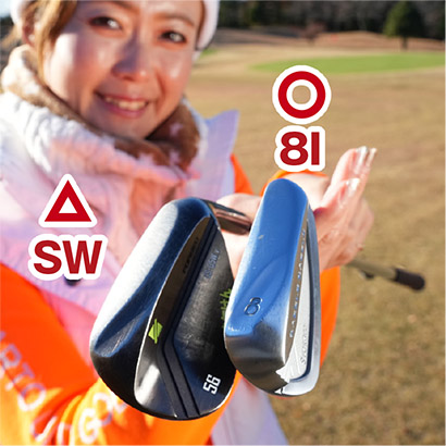 ウェッジはアイアンの中でもソールが厚いから、フェアウェイが硬いとソールが跳ねてトップが出やすいし、直接グリーンに乗せるのもちょっと危険。なので8番アイアンのハーフスイングがオススメ。スタンスは少し狭くし、ボールの位置はスタンスの中央。時計盤をイメージして、9時くらいの高さまでテークバック。フィニッシュは3時くらいの高さです。振り幅は小さいけれど、胸を左右に回転して手首をコネないで打つのが大事なポイント。
