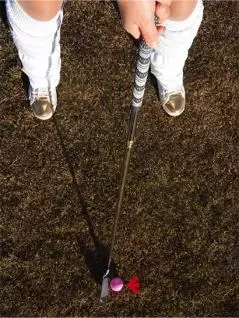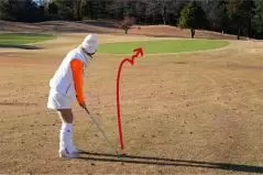 フェース面をボールに当てて終わりの感覚ですから、フォロースルーは惰力にまかせればOK。「イチ、ニのサーン」という感じでゆっくりしたリズムで振るとインパクトが緩みやすく、冬の硬い地面では絶対NGです。クラブは特に短く持たずに、通常のショットと同じ長さで構いません。グリーンの手前からコロがしていくので、この場合もバンカーなどのハザードを避けてください。このテクニックを教えてあげると、「おっ、いいじゃん!」と皆さん、とても喜んでくれるんです(笑)。