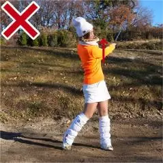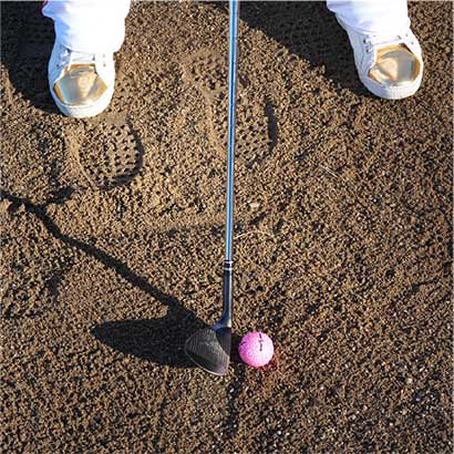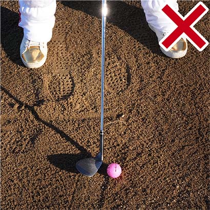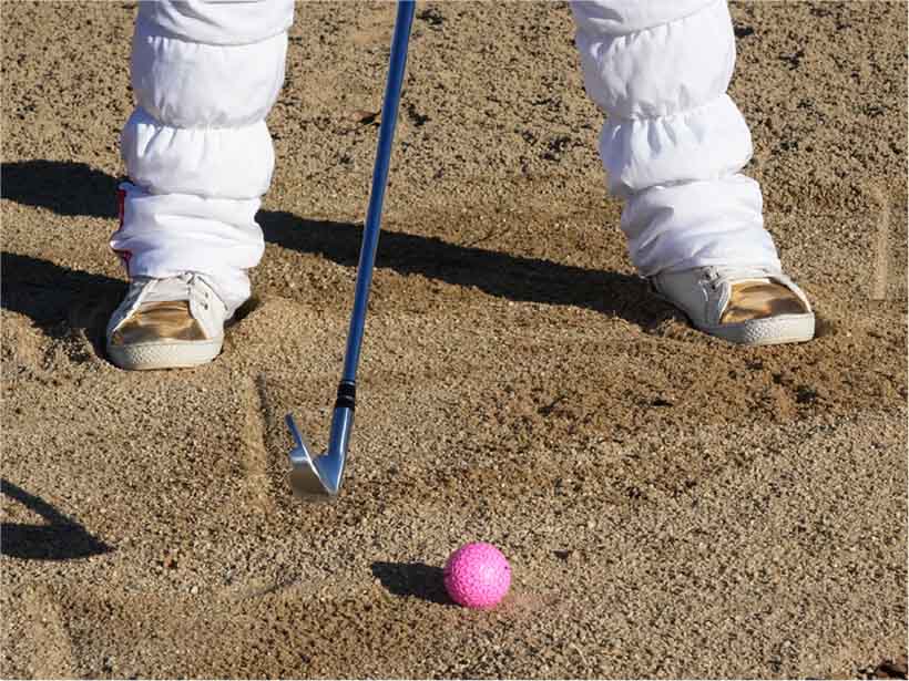 フェアウェイバンカーからのショットでも下の砂が硬いとシューズが滑りやすいので、足場をできるだけ固めて構えましょう。日当たりがよくて砂が軟らかくなっていれば通常と同じでOK。足の裏で砂の硬さを感じ取ってアドレスを微調整してくださいね。ボールの位置はスタンスの中央か、やや右寄りがグッド。距離を出そうとして振り回すと足元が滑ったりよろけたりして球がとんでもない方向に行っちゃいます。なるべくミス小さく抑えるためにもフルショットの4分の3くらいの振り幅で打ちましょう。