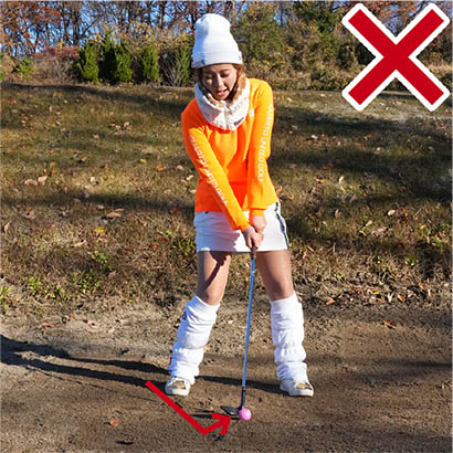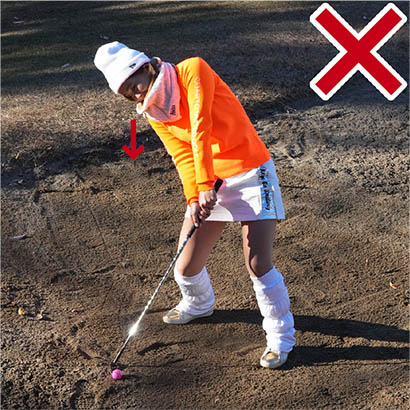 冬のバンカーはフェースを開かないでスクエアにセットするのがベスト。これだけでバウンスが使いにくくなり、トップが防げちゃいます。ボールの位置はスタンスの中央よりもボール1個分左。もう一つのポイントはスクエアスタンスに構えること。軽いオープンスタンスに構えるのもダメではないですが、極端なオープンスタンスはNG。「フェースを開いて、オープンスタンスに構えてカット軌道で打ち抜く」なんて難しく考える人が結構多くて、そんな人に限ってバンカーが苦手なんですね〜(笑)。