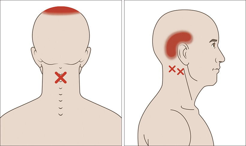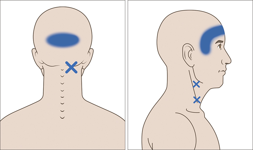 秋山院長は、緊張性頭痛が起きるメカニズムをこのように教えてくれました。肩、首の張りやコリが悪化したトリガーポイントが原因となり、頭頂部、こめかみ、後頭部、目の周りなどが痛むのが緊張性頭痛の正体なのです。
