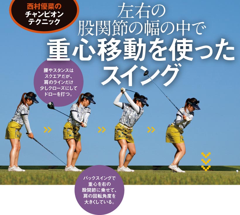 西村優菜選手は地面反力を使わないで、横の体重移動を使ってスイングするタイプ。背の高い人は地面反力が向いていますが、西村選手は身長があまりないので軸をキープして、左右の股関節の幅の中で重心移動をしています。